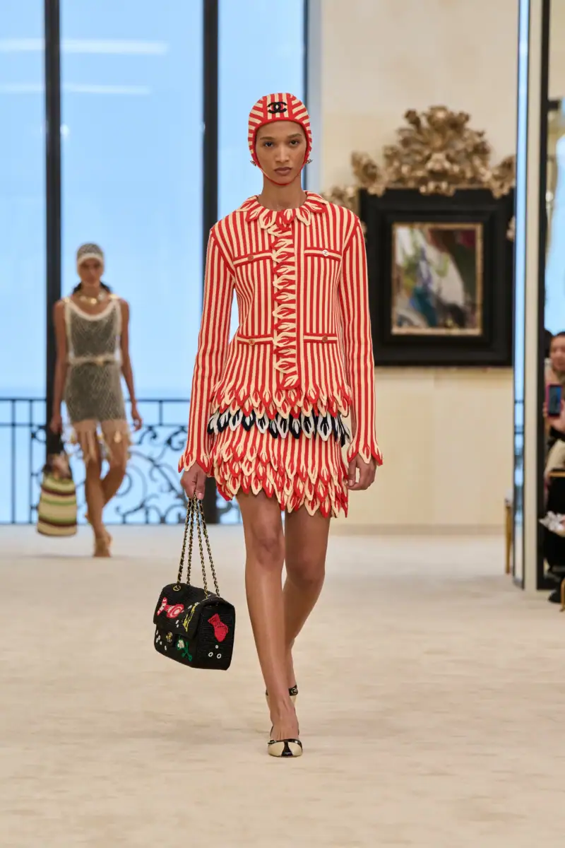 Chanel artistic director Matthieu Blazy opened up his first cruise show for the label with a trio of art deco inspired looks all in black; with the signature Blazy twist. Loose dress silhouettes were dropped low, suits were loosened up and inspiration seemed to be pulled from an antique bathing suit made modern. After all, the little Chanel logo bathing costume was accessorized with a scarlet red crochet flap bag, logo belt and a Chanel jacket trimmed in a menagerie of starfish and coral crochet, replete with seashell buttons.