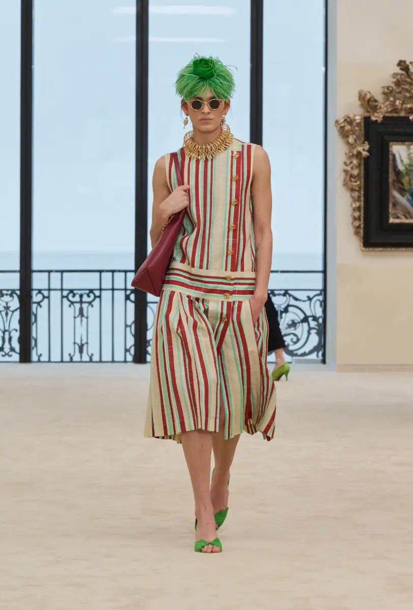 Taking place in Biarritz, France, Chanel’s Cruise 2026/26 collection continued Blazy’s concept of paying tribute to Gabrielle Chanel’s lore. She opened her first couture shop in the city in 1915. “Far from the Paris salon, Chanel found in Biarritz different ways of being and seeing, of movement and freedom,” Blazy stated in the show notes. “She made them her fashion pedestal. It is a place that offers the perfect balance between function and fiction. Among artists, workers, nobility, sailors and the natural world, everyone and everything shared the same stage, living together as a norm. All had a role to play.”