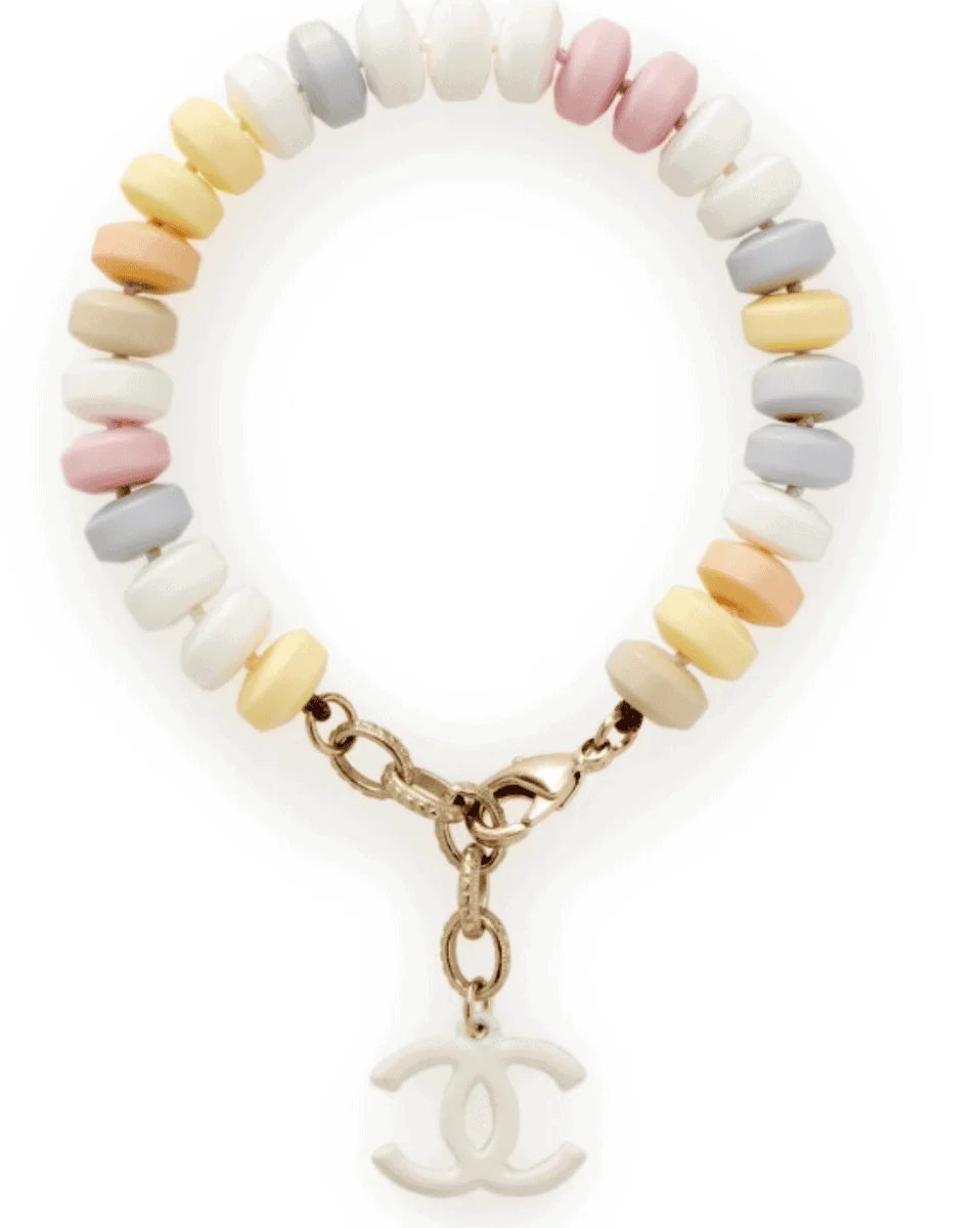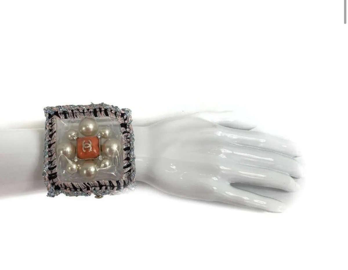 One of the most amusing and genius pieces of jewelry from Chanel fall 2014 is the necklace and bracelet that encompasses the classic Chanel Gripoix glass and pearl logo medallion under vinyl, designed to look like grocery story plastic wrap. The edges are lined with knitted trim. These pieces–while not nearly as ubiquitous as the candy necklaces or padlocks–are incredibly hard to find. I recently picked up the bracelet for my collection. There’s simply nothing else like it.
