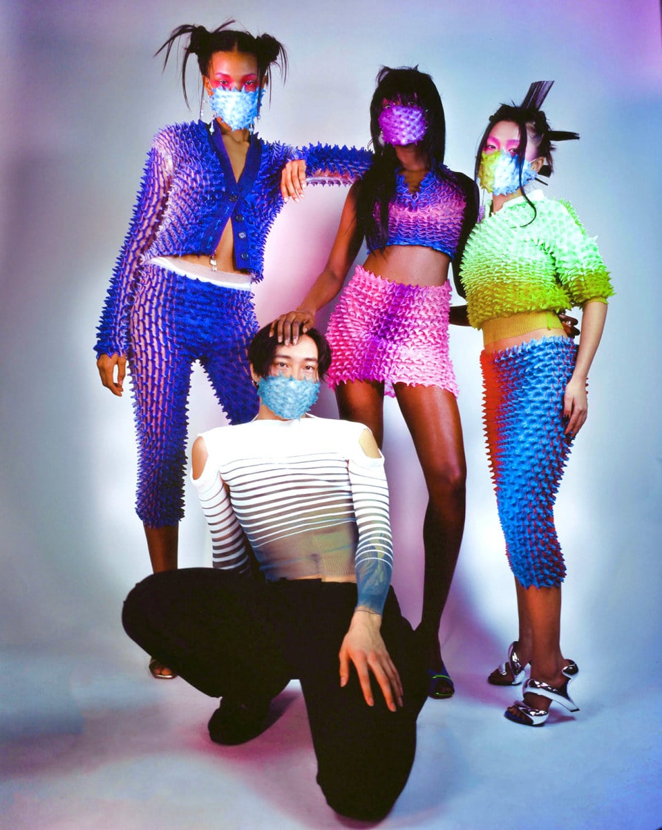 In the year 2021, when many of us have been largely at home, there is a rising trend of bodycon silhouettes and futuristic textures. Designer Chet Lo strikes the balance between the two, with vibrant spike sculpted fabrics that resemble the classic popcorn ripples from your favorite childhood stretchy top, on steroids. We mean that in the best possible way. And if designer Chet Lo wasn’t already on your radar, his pieces have recently been worn by Zara Larsson and Kylie Jenner.