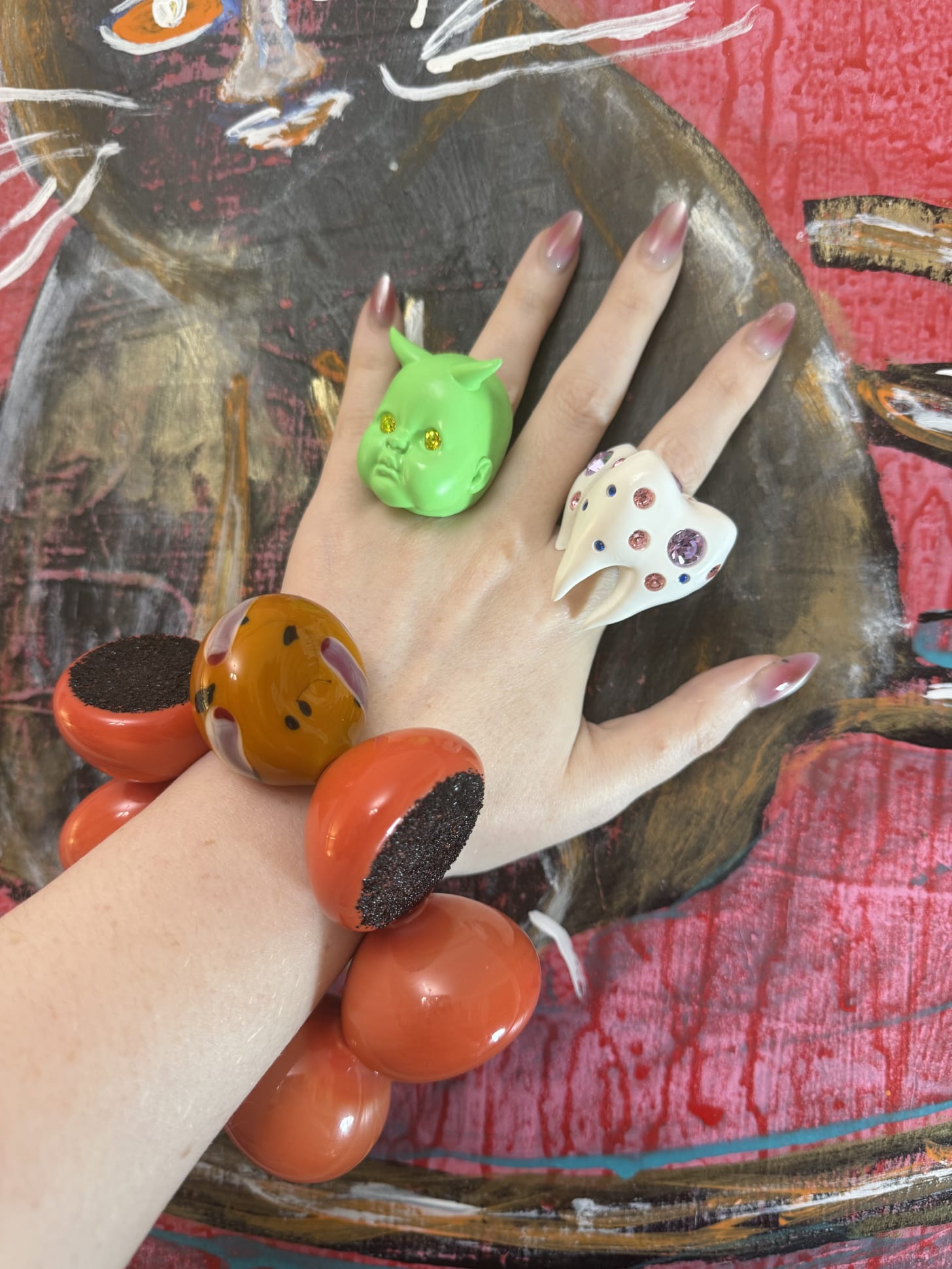 I took home this incredible hand-blown chunky Murano glass bracelet from Studio Vero Vetro in Tuscany. I love how big it is, and it reminds me of Grapefruit Brûlée. I wore it styled with my Dollchunk rings.