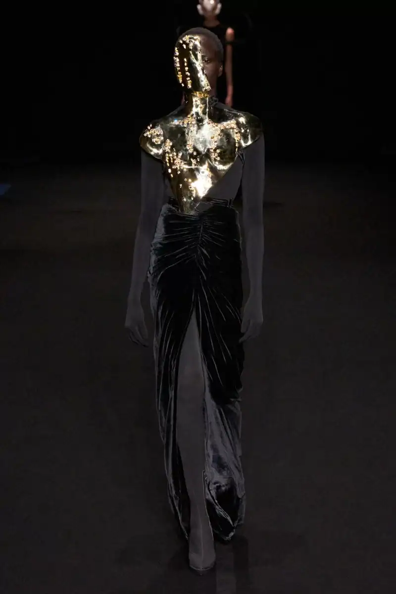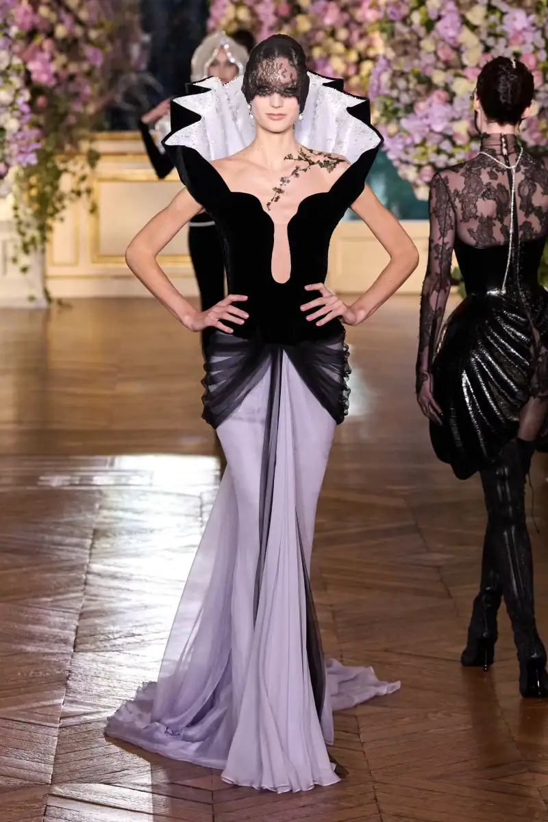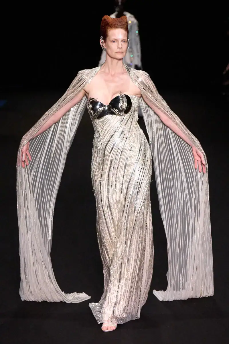 Gaurav Gupta’s haute couture spring 2025 show is the kind of increasingly rare collection you think about for hours, days, maybe even months. The Indian based designer has over 1 million followers on Instagram, but for many who aren’t extremely familiar with haute couture, his name might not be recognizable. Navkirat Sodhi, the designer’s life partner, poet and performer, opened the show with a powerful homage of resiliency after suffering in a recent house fire, deliberately showing her scars under a sheer, diaphanous dress. Gupta specializes in surreal, new world alien-like looks, like futuristic warped gowns and wildly imaginative dresses that wrap around the head and body like otherworldly, glittering shields. This is couture for a new world.
