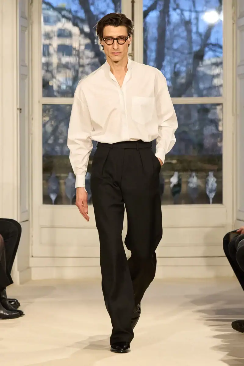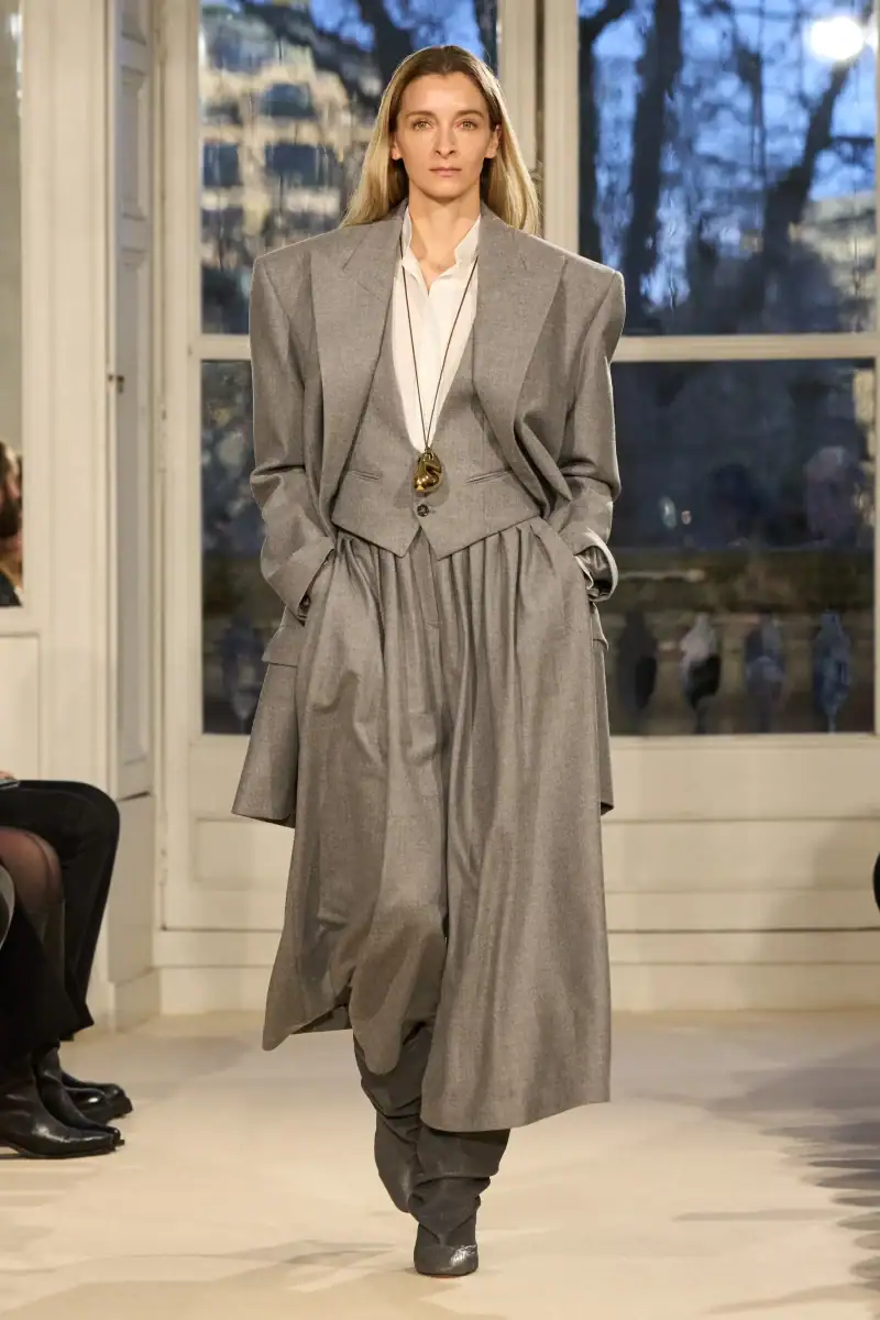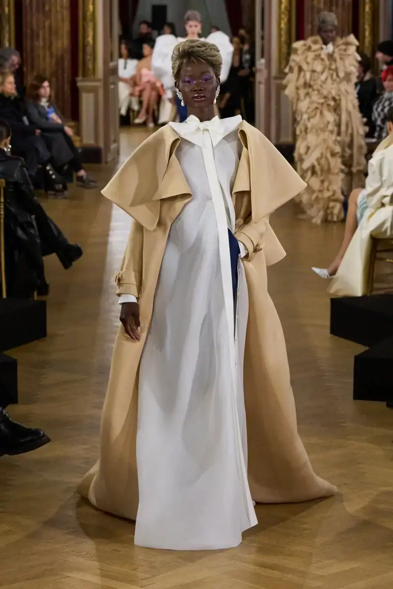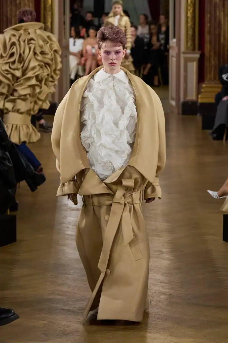 Viktor and Rolf’s spring 2025 haute couture collection proved that the designer duo are still the kings of camp and also adept at designing high concept pieces that aren’t lacking in humor. The designers approached this season with the theme in mind of “a human interpretation of AI,” working with an underlying narrative of repetition. We saw all different iterations of Italian silk gazar by Ruffo Coli, turned into various white shirts, beige trench coats and navy pants. It may have been the best rebuttal and take on the recent quiet luxury epidemic yet. And yet, the model holding a Victorian doll with a matching outfit and hairstyle that looked like a mashup of Princess Diana and Banana Republic catalog style was actually one of the most memorable, and viral moments to stick in our minds.