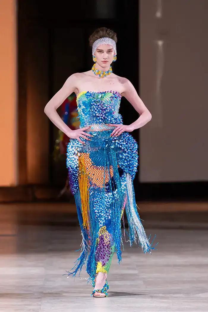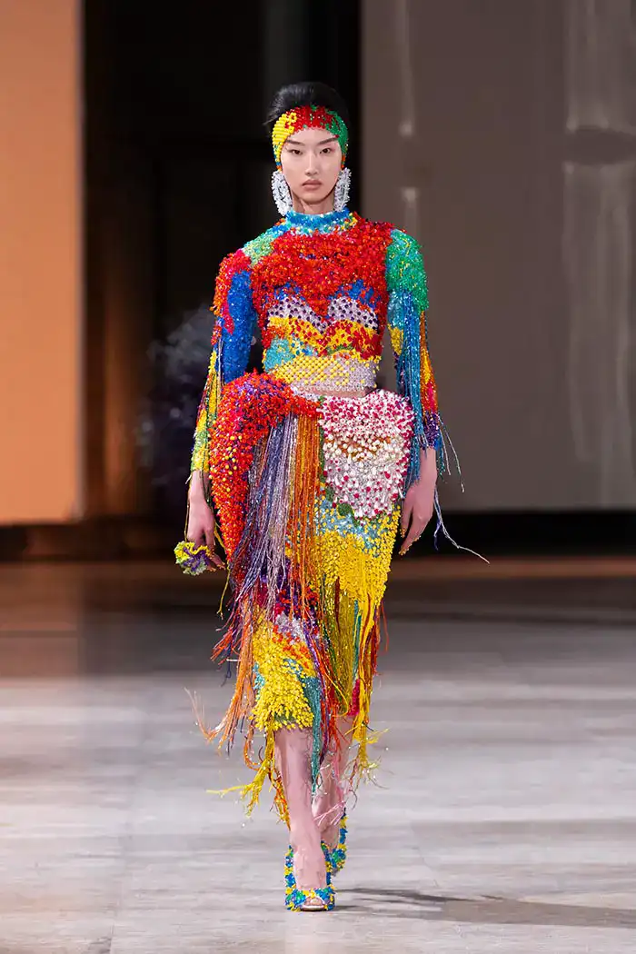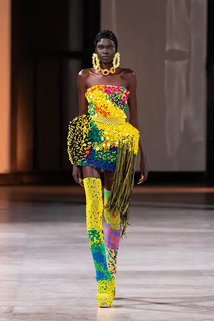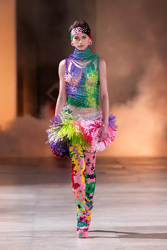 Germanier has been creating explosions of color and shape for his ready-to-wear collections for a few years, and for spring 2025, he finally got to show his first couture collection, closing the week out with a bang. This collection felt joyous and entirely its own, totally expressive of the individualist aesthetic designer Kevin Germanier has built. From the wildly whimsical knit sets to the sparkling Koosh ball gowns, there was absolutely no shortage of inspiring originality here.