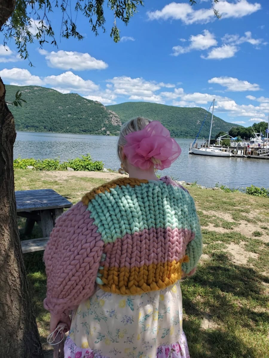 The Bella Colossal Knit, like all of Hope Macaulay’s pieces, is entirely handmade. When I ordered it from her online shop (she currently has such a high demand she can only open weekly for minutes until she receives the maximum number of orders she can produce with her small team) it took about three weeks from the time I ordered to receive it.