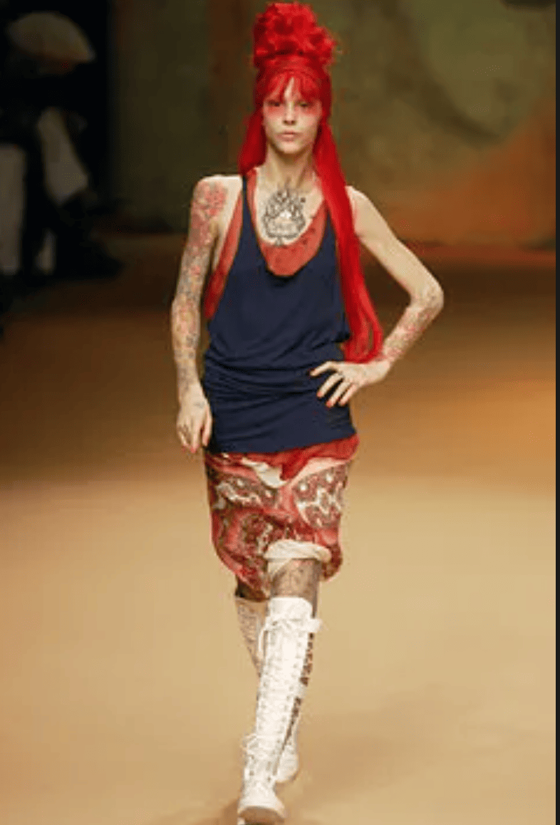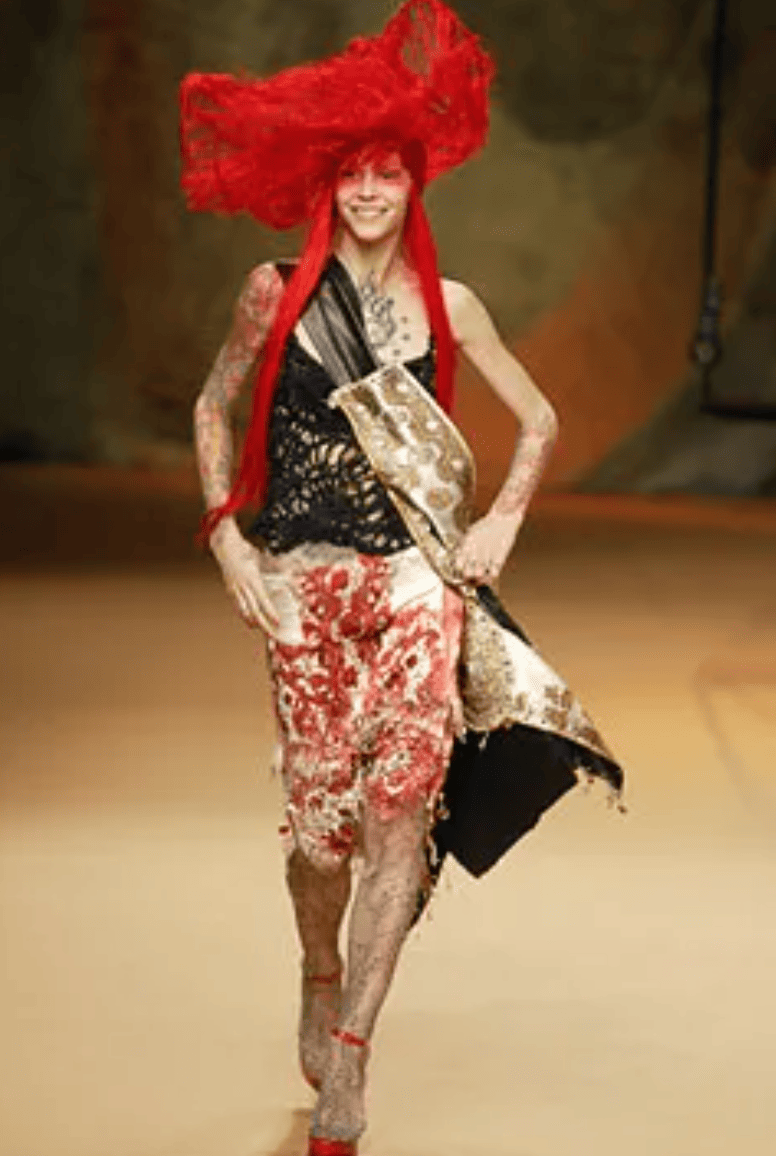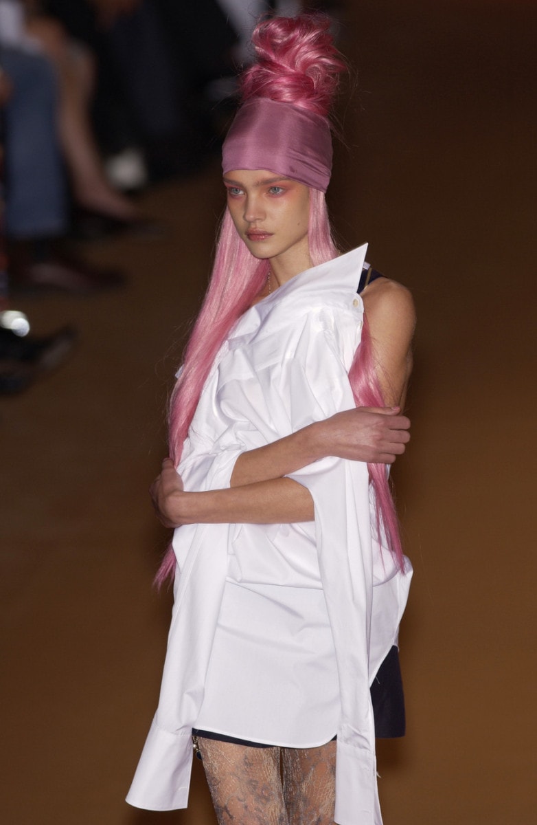 There’s another image of Natalia Vodianova from Jean Paul Gaultier Spring 2003 that also achieved a sort of viral fame. In it, the same insanely long pink hair is pilled atop her head in a topknot with a matching wide pink scarf wrapped around her forehead.