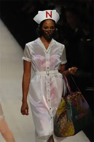 Naomi Campbell, Eva Herzigova, Stephanie Seymour and nine other models walked down the runway in sheer pastel nurse get-ups with matching little hats, each embellished with one scarlet letter that together spelled out the “Louis Vuitton” name. There is so much to unpack in these opening looks of the show, that everything begins to verge on post ironic. Models wore their hair in 1950s style retro curls, with sheer logo face masks. Each model held the poetic bags created in collaboration with Richard Prince.