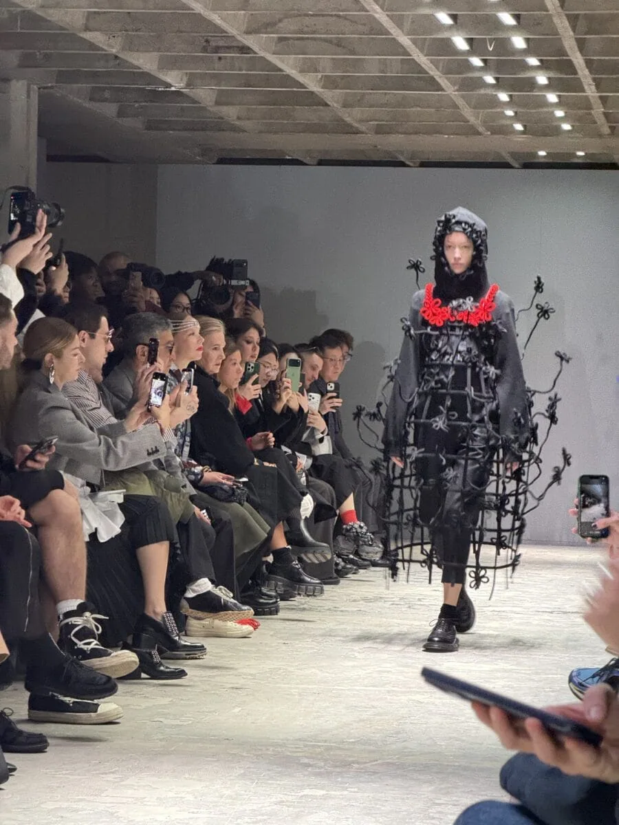 1PM: time for my favorite show of all of fashion month: Noir Kei Ninomiya. I got married in several of his dark glam dresses combined with Simone Rocha. The show took place inside another garage-like space, with a very narrow runway and only a front row, with the rest of the crowd standing. Incredible sculpted tulle skeleton puff dresses made my jaw drop, and I’m also excited about the new Puma collab. Each model was surrounded by an enchanting cloud of darkness via huge geometric star harnesses and floral sculpted exoskeletons. Hulking spiked appendages shaped like flowers, rib cages and other geometric wonders felt like beautiful defensive mechanisms against the world. The genius of Noir Kei Ninomiya is also the styling. Underneath all the amazing optical show-offs are things like little little tulle dresses, sculptural jackets and smaller harnesses that you can wear alone or build up for an out-of-this-world outfit.