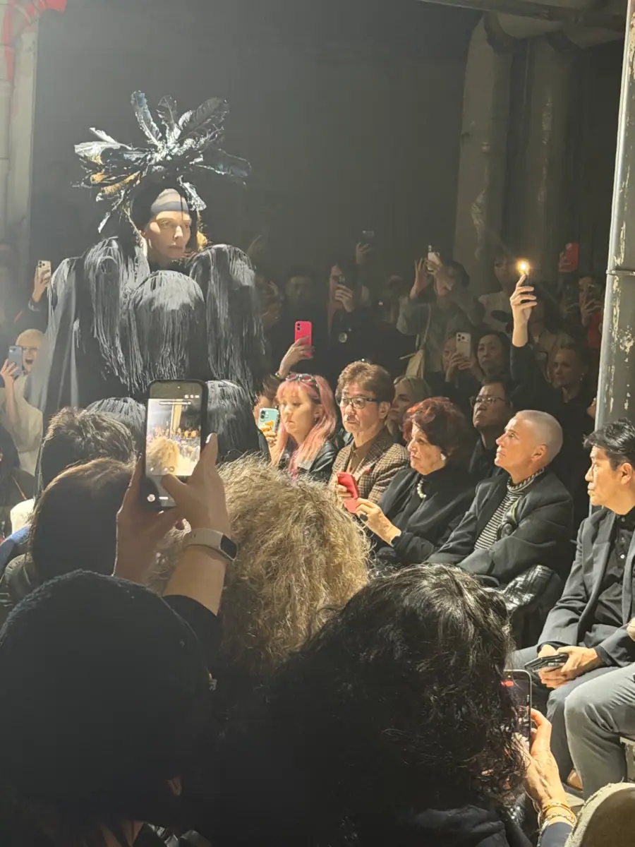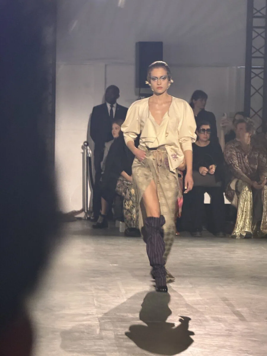 But the next stop was Ann Demeulemeester, where quickly I realized I was sitting diagonally behind Ann herself. Stefano Gallici is now designing the collection, appointed creative director as of 2023. I overheard Ann say that she was originally sitting in the middle of the venue but she wanted more privacy, so she asked to be moved to the end and I thought that was a very Ann thing to say. The collection felt heavily vintage and antique inspired with tons of lace, shearling, and military jackets, ranging in references from the 1960s to 1990s. Billy Idol walked the show and that was incredibly iconic.