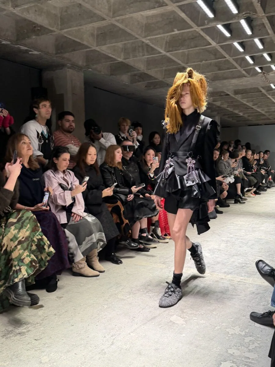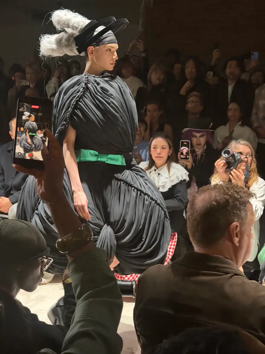 The show notes called it, “The Art of Assemblage Couture,” citing, “form born from pure creative instinct, free from conventional notions of dressmaking. Through the direct presentation of raw materials, this approach expresses the surrounding social environment.” The tactile textiles felt so human and raw; absolutely worthy of staring hard to see all the little details–a glove here, mirror there, faux hair everywhere. With the strong accordion and piano music, black and white checkerboard floors, and intentionally dramatized, emotional model walks, the clothing was animated and brought to life, personified. It felt like a smart yet camp take on Watanabe refracting back the artificial idea of French fashion through his own language. Super interesting.