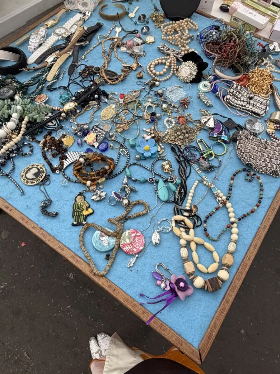 While on the way to Junya Watanabe, I saw a couple different flea markets in the streets not too far from the venue. I had a break after my first show, which meant I had enough time to check out one of them. Found lots of very good, strange jewelry. The score of the day was a chunky Edouard Rambaud brass fish necklace. Even the worst of the worst street markets in Paris are pure perfection: I love trinket hoarding.