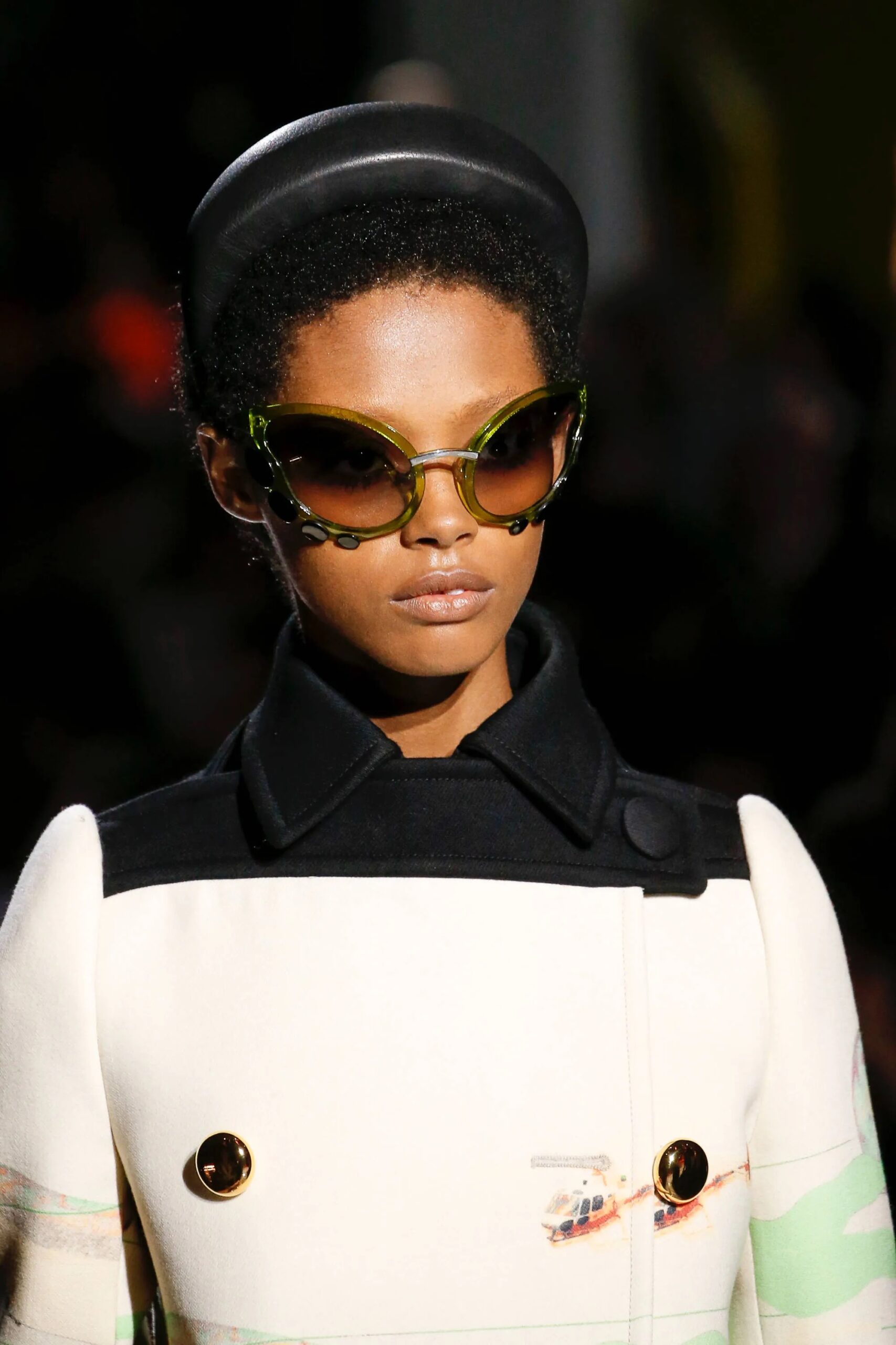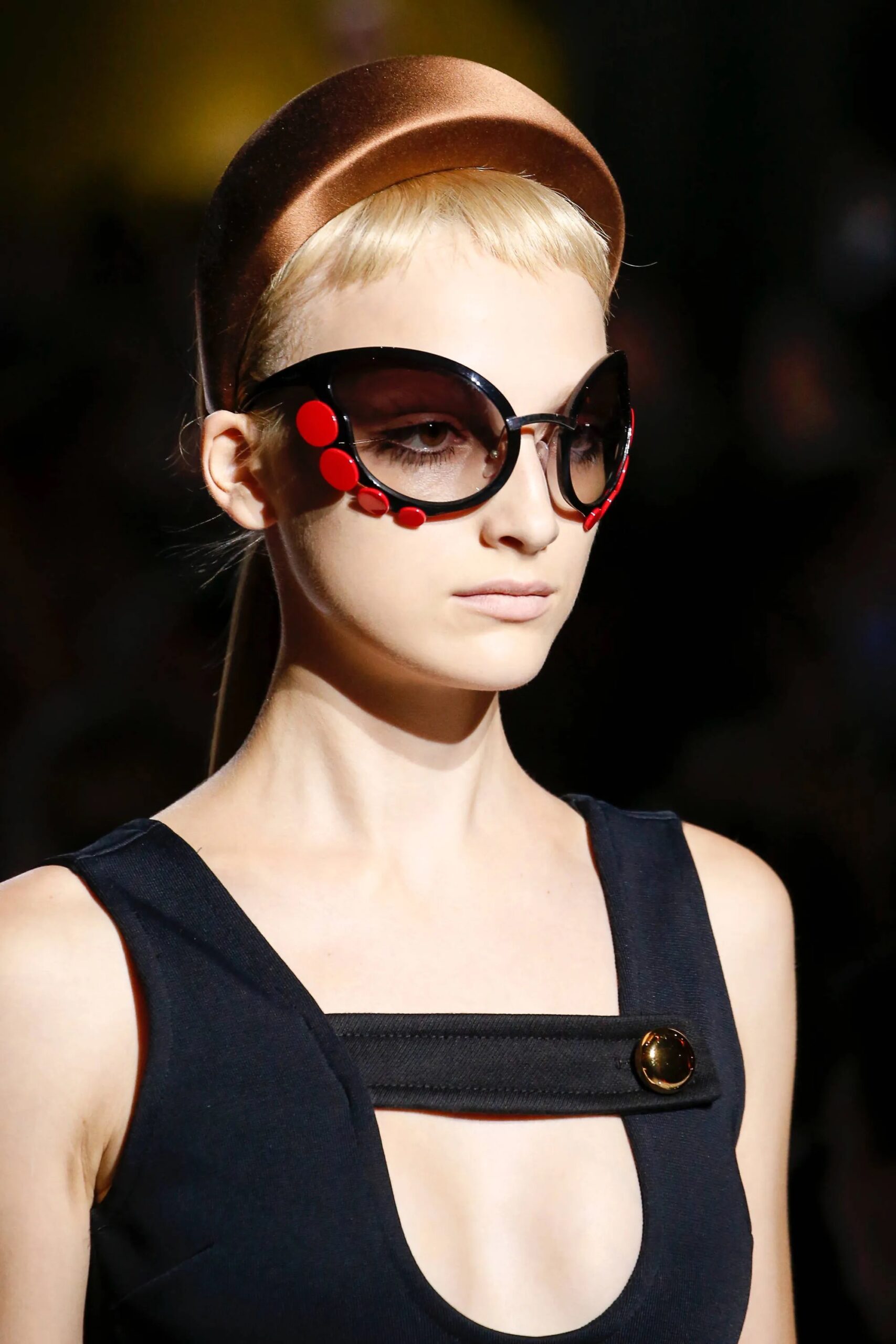 Models walked the runway in deliciously odd combinations of boyish-meets-’60s-doll ensembles topped off with deliriously stunning madcap headbands covered in a collage of sequins, studs and other finishing touches. Each model wore a super short, ultra cropped haircut, a la Mia Farrow or Edie Sedgwick. And there they were! A little more than midway through the collection, the gloriously freaky sunglasses had arrived.