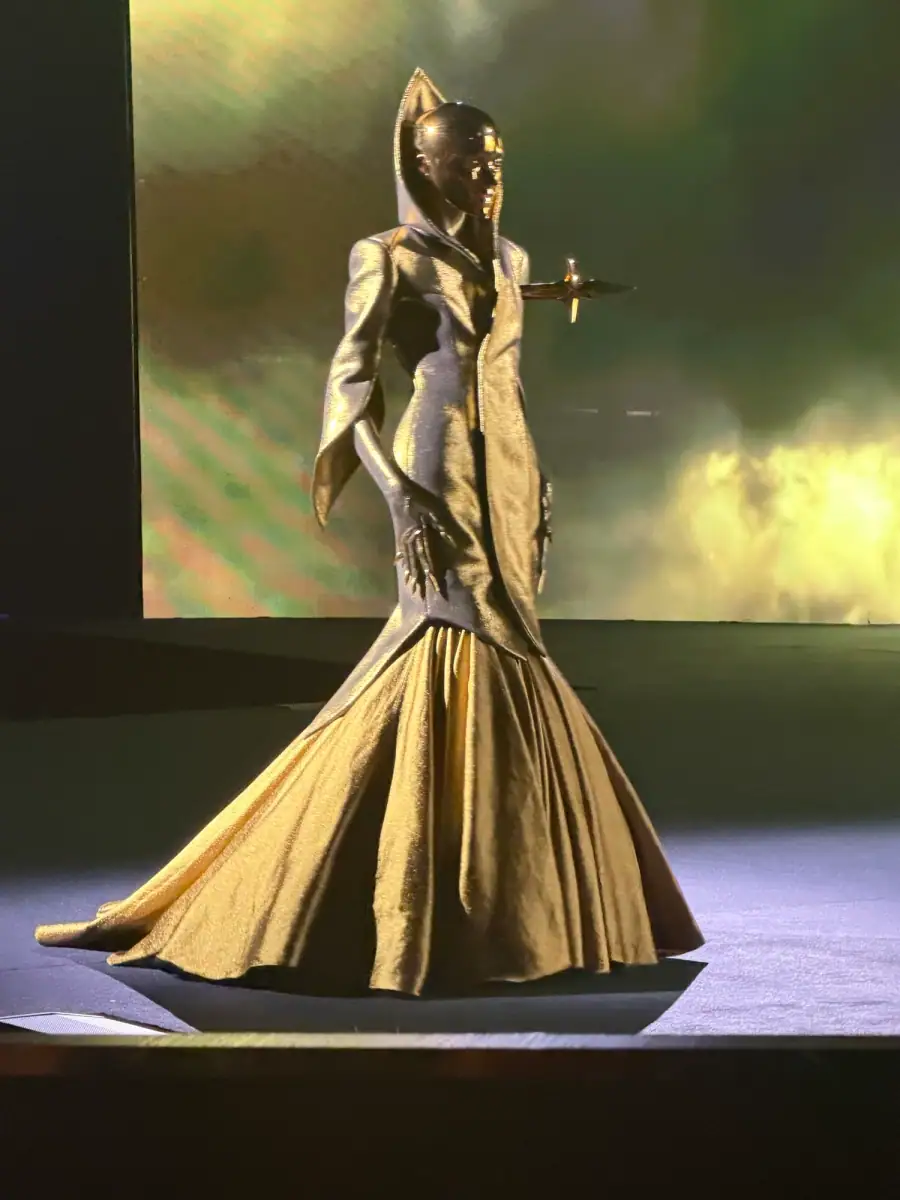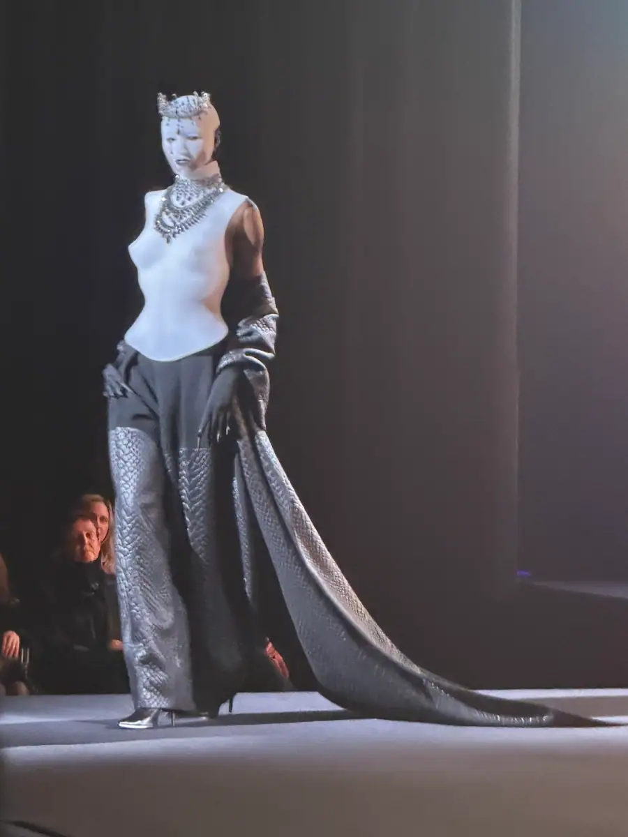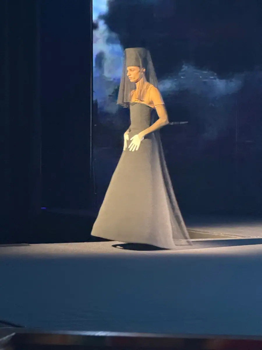 In the world of couture, Robert Wun has become the reigning surreal king of camp. Think: floor-skimming gowns covered in a galaxy of decaying glitter, or structured chest plates with masks and headpieces that verge on costumes for unusual characters from another land. The designer always pushes the boundaries of wearability and fantasy, but for spring 2026, he took it one step further. Models walked the stage inside a theater with a stormy backdrop that oscillated between different weather scenarios.